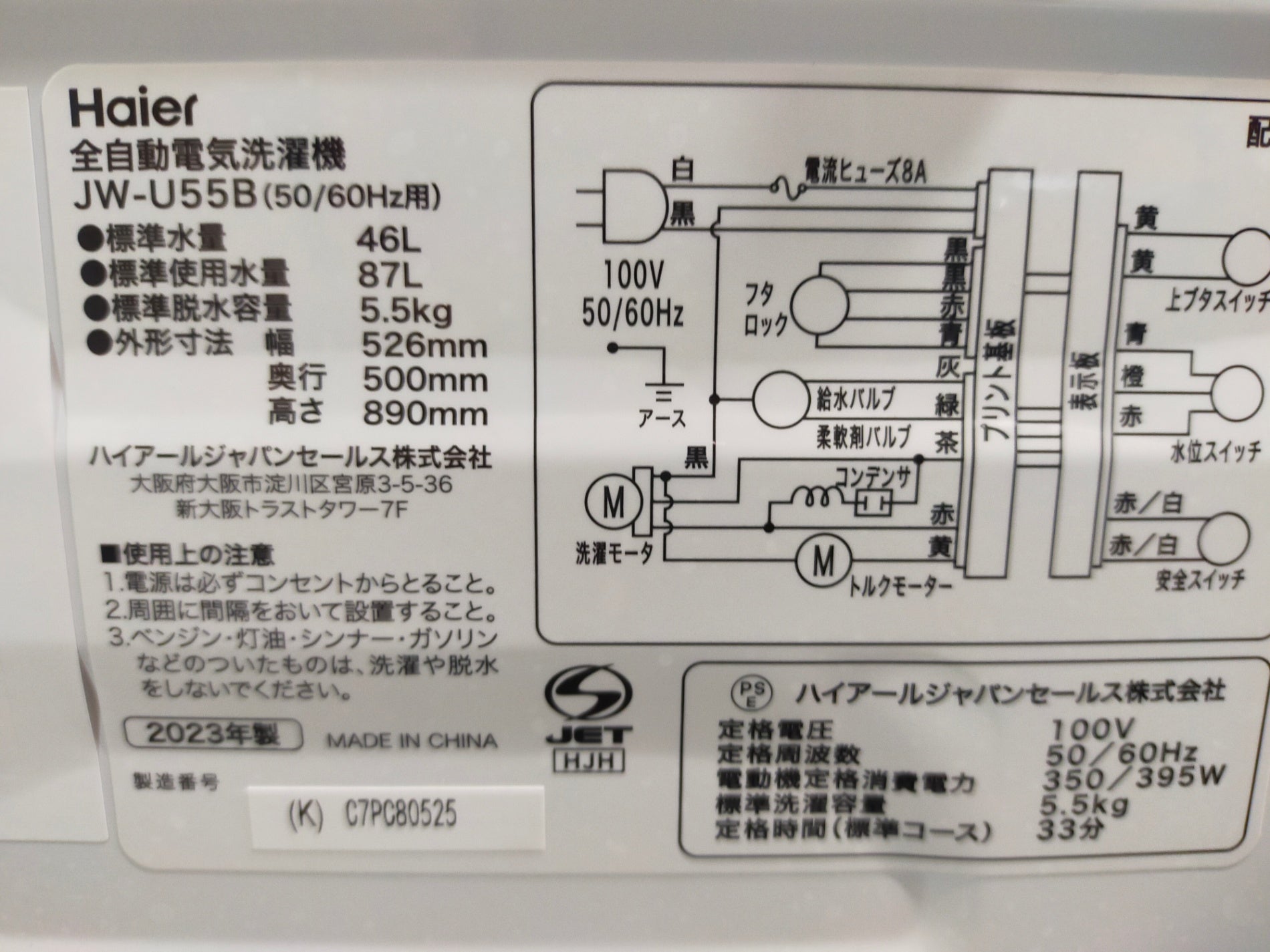 【サテライト】洗濯機 ハイアール JW-U55B 5.5kg 2023年製