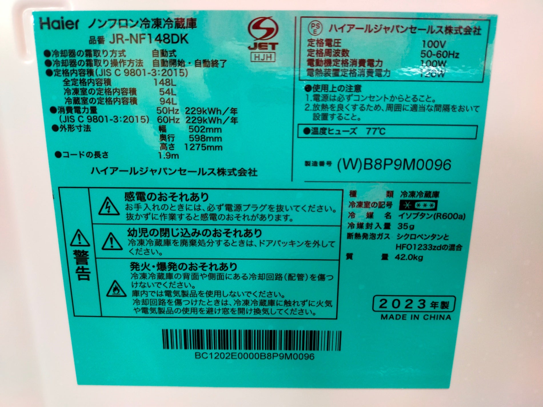 ◆型番:JR-NF148DK